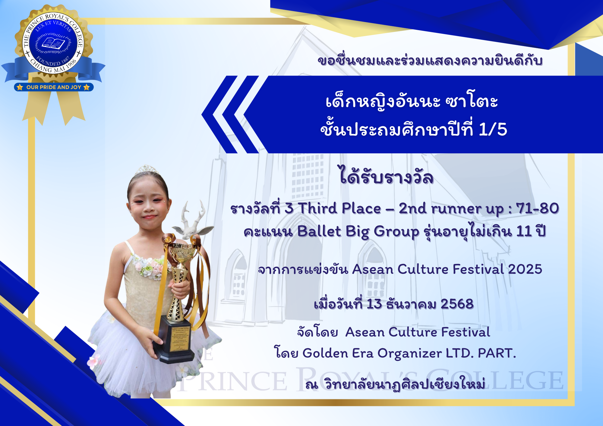 ได้รับรางวัล รางวัลที่ 3 Third Place – 2nd runner up : 71-80 คะแนน Ballet Big Group รุ่นอายุไม่เกิน 11 ปี