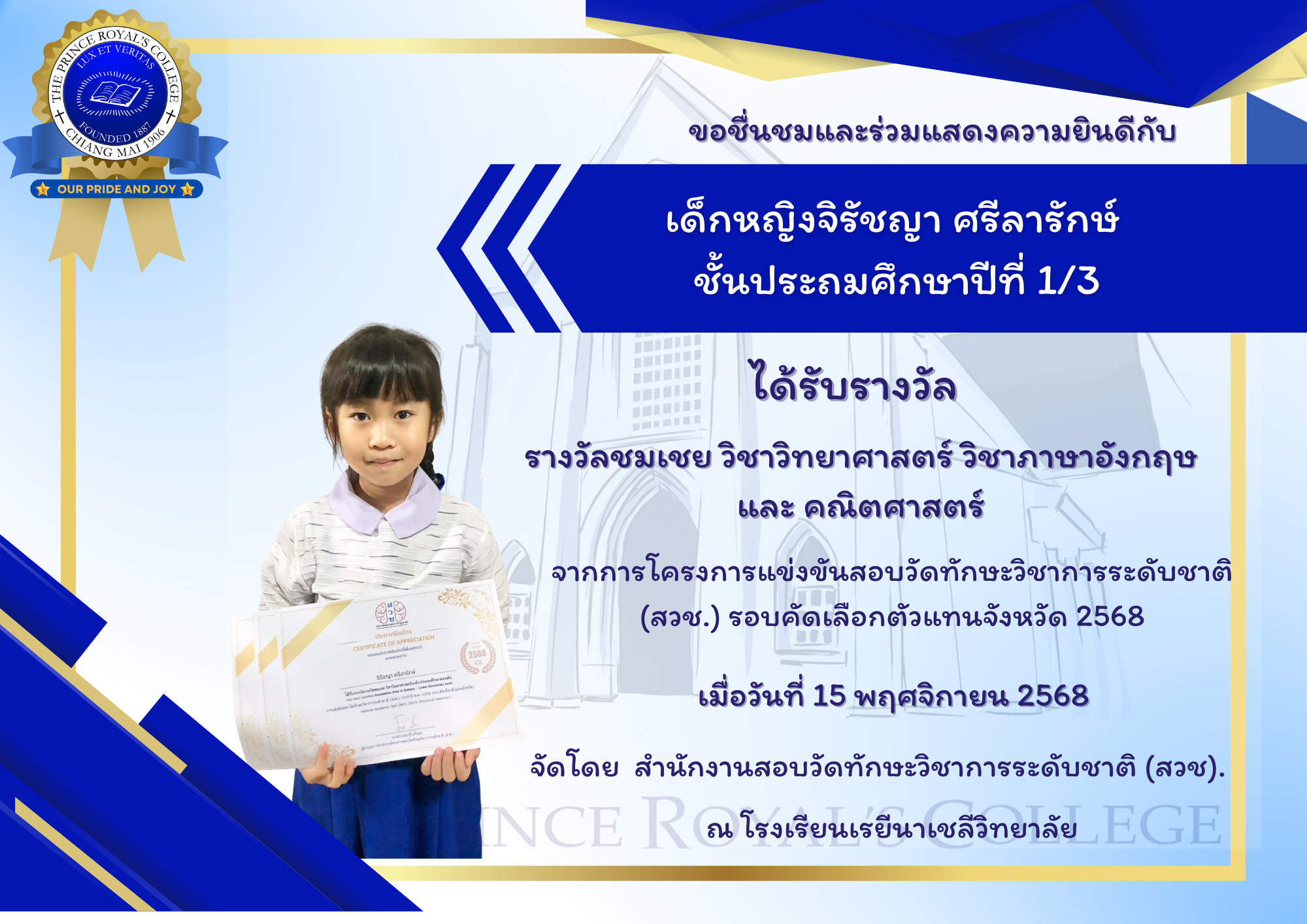 ได้รับรางวัล รางวัลชมเชย วิชาวิทยาศาสตร์ วิชาภาษาอังกฤษ และ คณิตศาสตร์