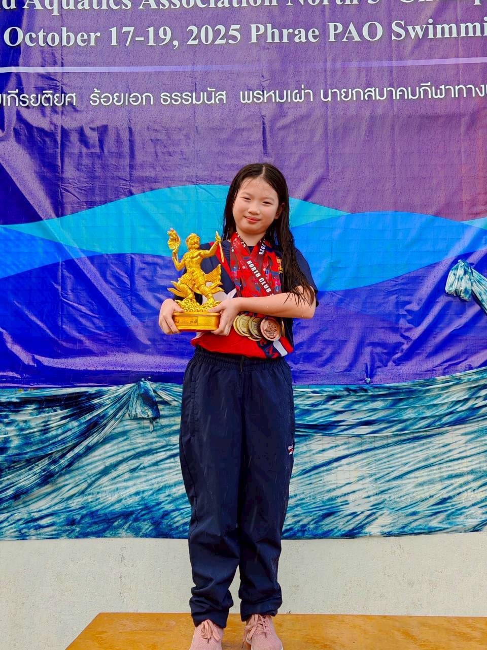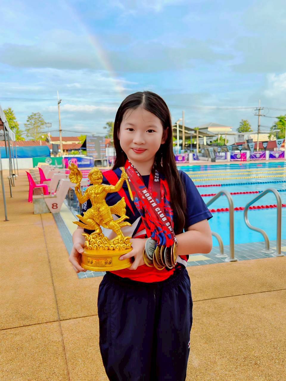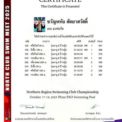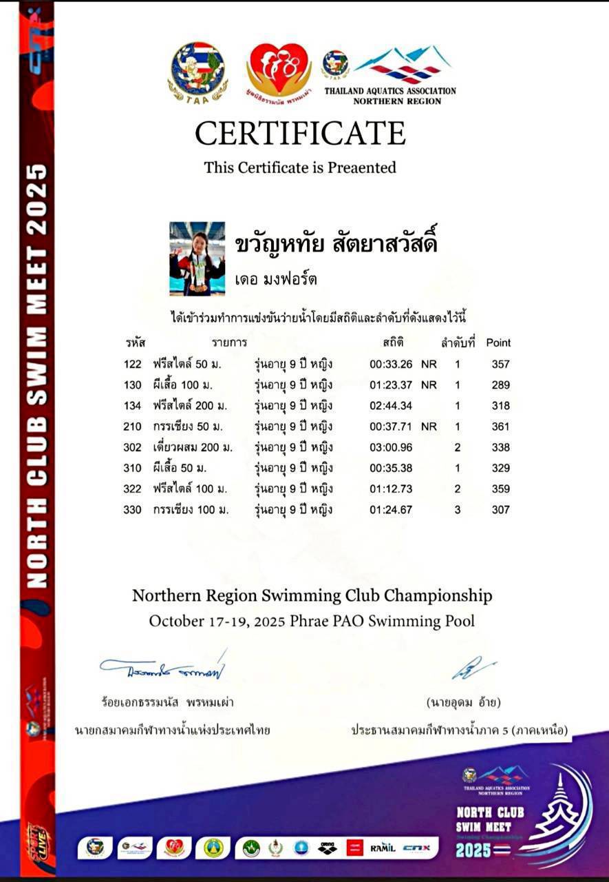 🥇🥇🥇🥇🥇 5 เหรียญทอง ท่าฟรีสไตล์ 50 และ 200 เมตร, ท่าผีเสื้อ 50 และ 100 เมตร, ท่ากรรเชียง 50 เมตร และทำสถิติใหม่ของภาคเหนือ ในท่าฟรีสไตล์ 50 เมตร, กรรเชียง 50 เมตร และ ผีเสื้อ 100 เมตร