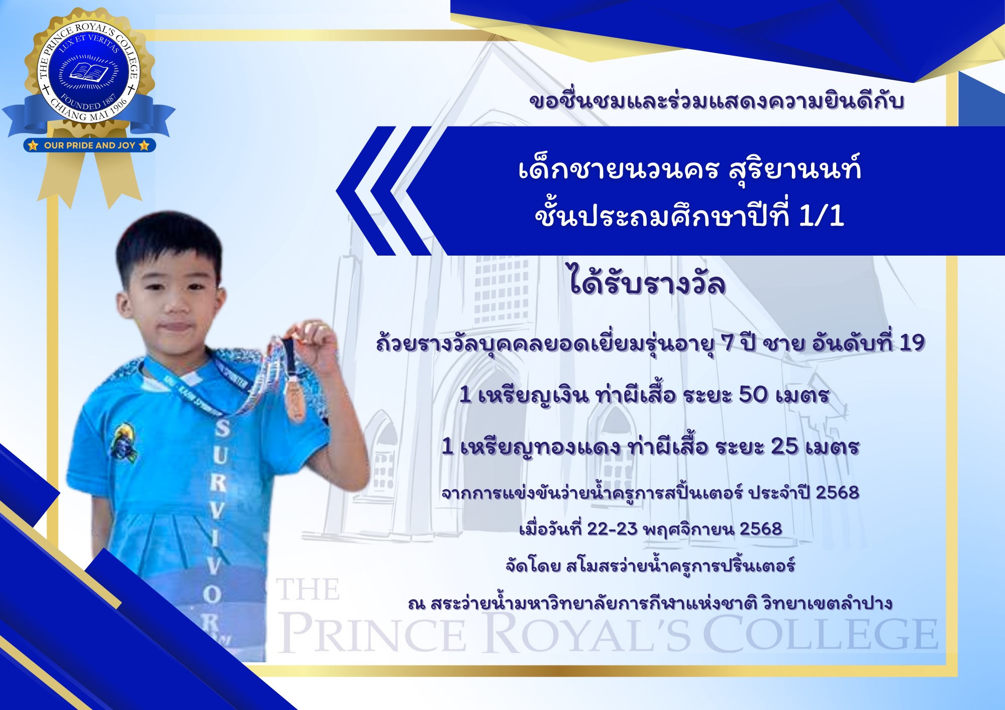 ได้รับรางวัล ถ้วยรางวัลบุคคลยอดเยี่ยมรุ่นอายุ 7 ปี ชาย อันดับที่ 19 1 เหรียญเงิน ท่าผีเสื้อ ระยะ 50 เมตร 1 เหรียญทองแดง ท่าผีเสื้อ ระยะ 25 เมตร