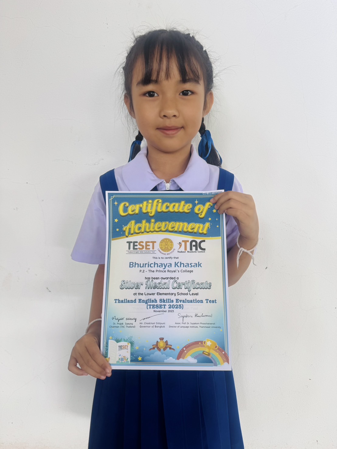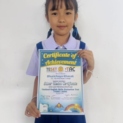 ขอชื่นชมและร่วมแสดงความยินดีกับเด็กหญิงภูริชญา ขาสัก ชั้นประถมศึกษาปีที่ 2/5 ได้รับรางวัล เกียรติบัตรเหรียญเงิน จากการแข่งขัน โครงการประเมินทักษะภาษาอังกฤษระดับประเทศ ครั้งที่ 6 (6th TESET – Thailand English Skills Evaluation Test) ช่วงชั้น1: (ป.1 – ป.3) บริษัท อคาเดมิค คอนเทสต์ (ประเทศไทย) จำกัด สนามสอบ ณ โรงเรียนหอพระเมื่อวันที่ 17 สิงหาคม 2568