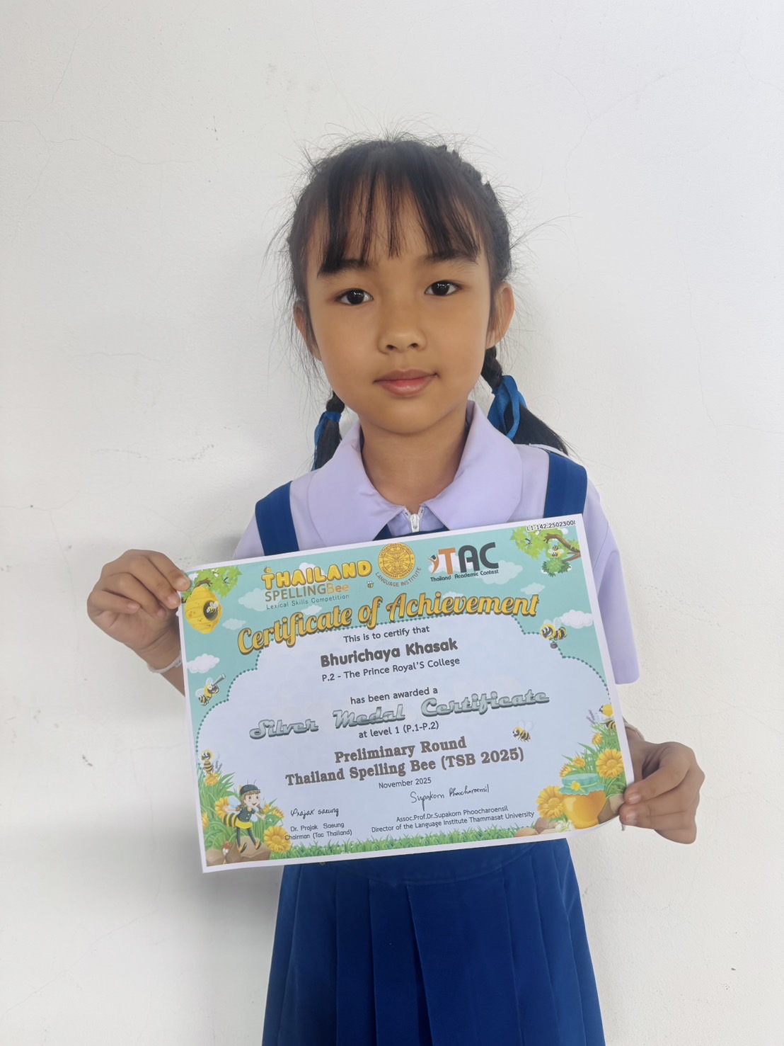 ขอชื่นชมและร่วมแสดงความยินดีกับ เด็กหญิงภูริชญา ขาสัก ชั้นประถมศึกษาปีที่ 2/5 ได้รับรางวัล เกียรติบัตรเหรียญเงินจากการแข่งขัน โครงการแข่งขัน Thailand Spelling Bee, TSB2025 Level 1: (ป.1 – ป.2) บริษัท อคาเดมิค คอนเทสต์ (ประเทศไทย) จำกัดสนามสอบ ณ โรงเรียนหอพระเมื่อวันที่ 17 สิงหาคม 2568