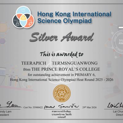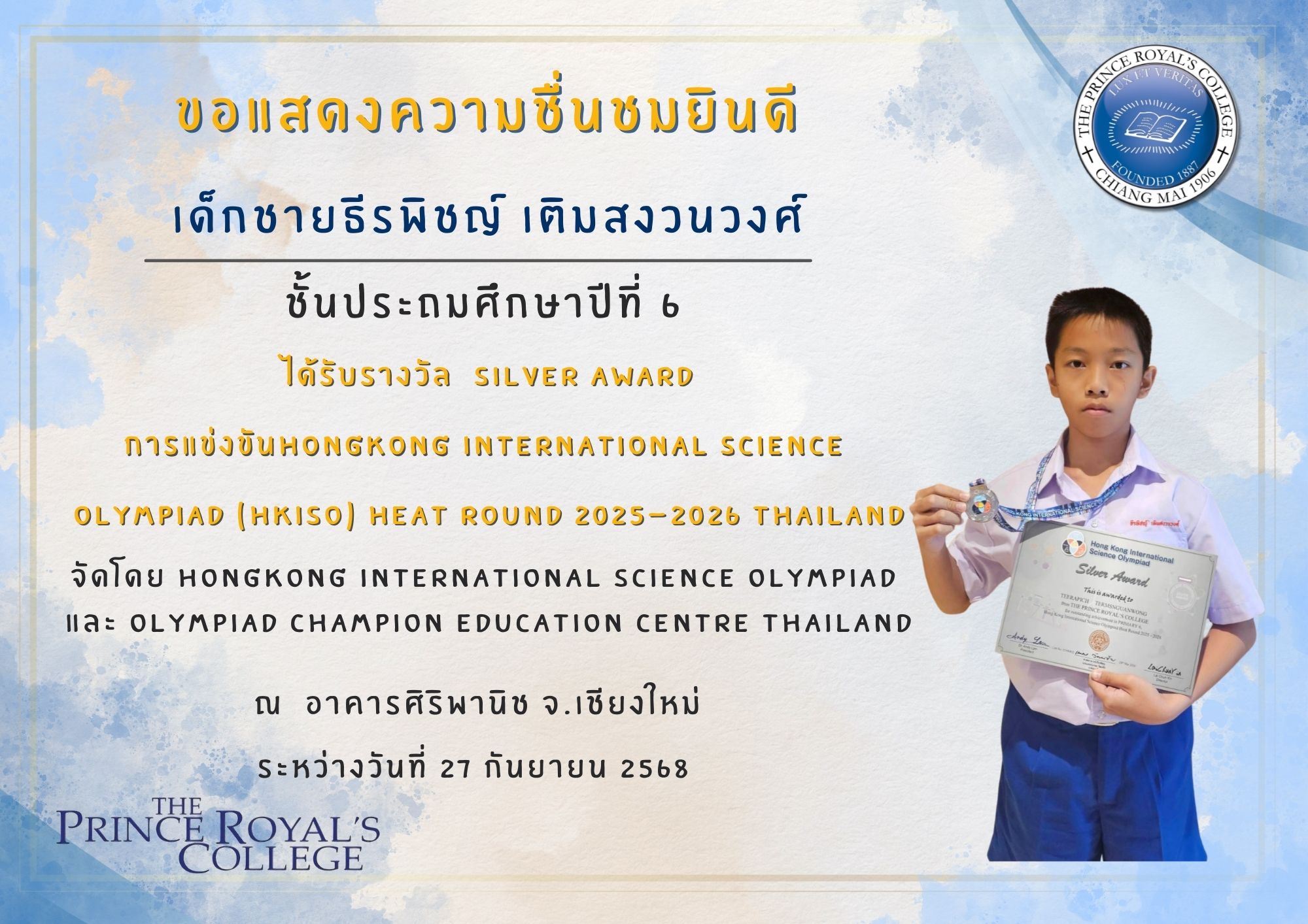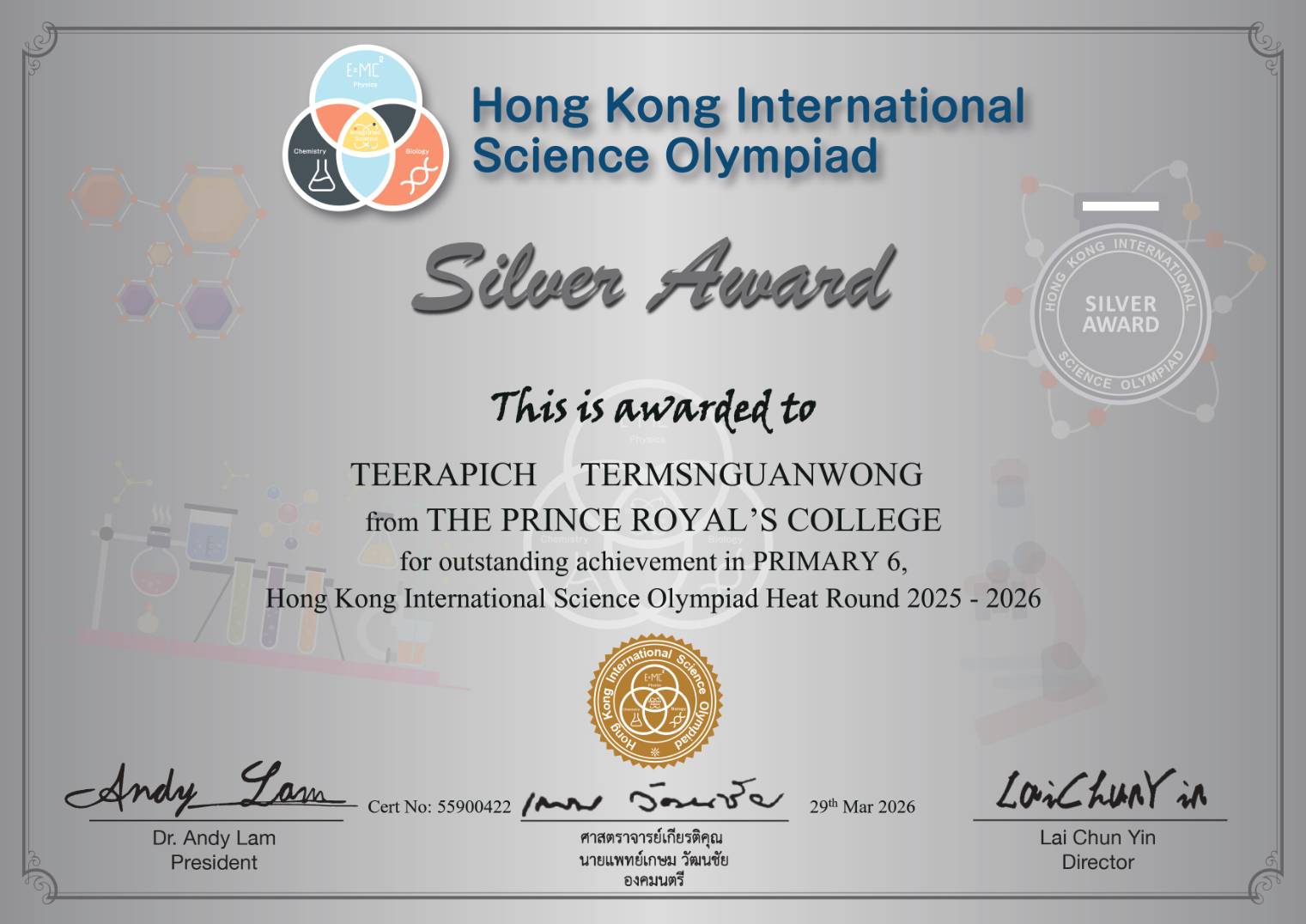 เด็กชาย​ธีรพิชญ์ เติมสงวนวงศ์ Hongkong International Science Olympiad (HKISO) Heat Round 2025-2026 Thailand