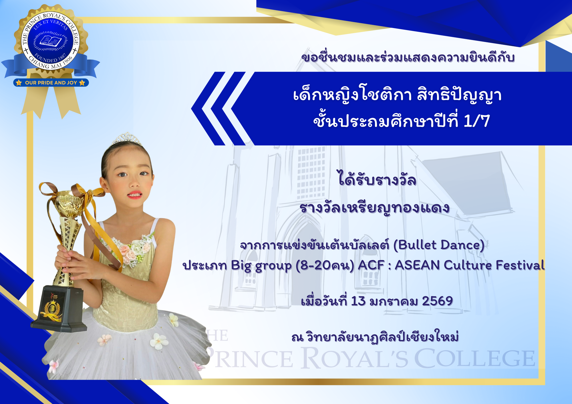 เด็กหญิงโชติกา สิทธิปัญญา ชั้นประถมศึกษาปีที่ 1/7 ได้รับรางวัล รางวัลเหรียญทองแดง จากการแข่งขันเต้นบัลเลต์ (Bullet Dance) ประเภท Big group (8-20คน) ACF : ASEAN Culture Festival
