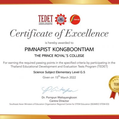 ที่ได้รับรางวัล Certificate of Excellence Science Subject Elementary level G.5 เกียรติบัตรผ่านเกณฑ์ที่กำหนด