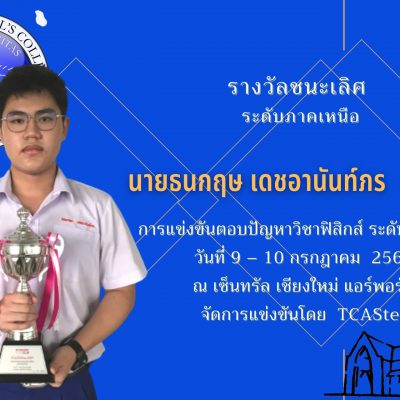 ขอแสดงความยินดีกับ นายธณกฤษ เดชอานันท์ภร ชั้น ม.6/3 ที่ได้รับรางวัลชนะเลิศ จากการแข่งขันตอบปัญหาวิชาฟิสิกส์ ระดับภาคเหนือ วันที่ 9 – 10 กรกฎาคม 2565 ณ เซ็นทรัล เชียงใหม่ แอร์พอร์ต จัดการแข่งขันโดย TCASter