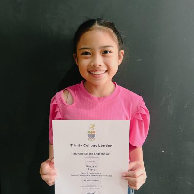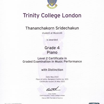 ที่สามารถสอบเปียโนเกรด 4 ของ Trinity college london ได้เกรียตินิยมอันดับ 1 ด้วยคะแนน 100 คะแนนเต็ม 100:100 ให้ไว้ ณ วันที่ 26 พฤษภาคม 2565