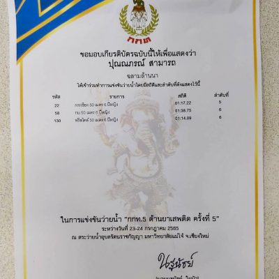 ขอแสดงความยินดีกับ เด็กหญิงปุณณภรณ์ สามารถ อนุบาล 3/4 เข้าร่วมการแข่งขันว่ายน้ำ “กกท. ต้านยาเสพติด ครั้งที่ 5” ระหว่างวันที่ 23 – 24 กรกฎาคม 2565 ณ สระว่ายน้ำอุบลรัตนราชกัญญา มหาวิทยาลัยแม่โจ้ จ.เชียงใหม่