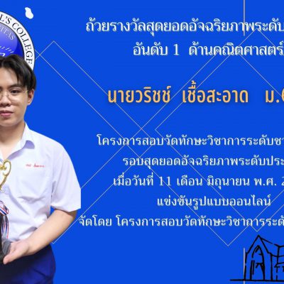 ขอแสดงความยินดีกับ นายวริชช์ เชื้อสะอาด นักเรียนชั้นมัธยมศึกษาปีที่ 6/3 ที่ได้รับถ้วยรางวัลสุดยอดอัจฉริยภาพระดับประเทศ อันดับที่ 1 ด้านคณิตศาสตร์ และเงินทุนการศึกษา 3,000 บาท จากการแข่งขันโครงการสอบวัดทักษะวิชาการระดับชาติ (สวช.) รอบสุดยอดอัจฉริยภาพระดับประเทศ เมื่อวันที่ 11 เดือนมิถุนายน พ.ศ. 2565 แข่งขันรูปแบบออนไลน์ จัดแข่งขันโดย โครงการสอบวัดทักษะวิชาการระดับชาติ (สวช.)
