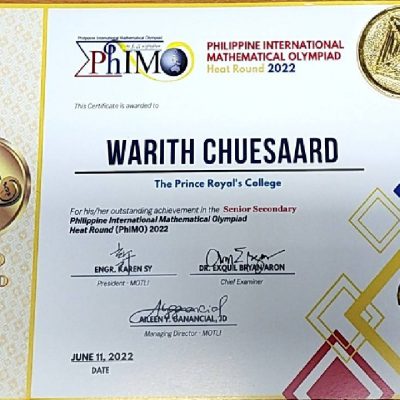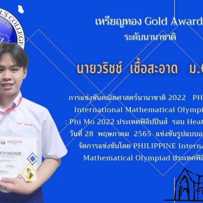 ขอแสดงความยินดีกับ นายวริชช์ เชื้อสะอาด นักเรียนชั้นมัธยมศึกษาปีที่ 6/3 ได้รับรางวัลเหรียญทอง Gold Award ในระดับนานาชาติ และรางวัลทุนการศึกษา 1,000 บาท จากการแข่งขันคณิตศาสตร์นานาชาติ 2022 PHILIPPINE International Mathematical Olympiad 2022 : Phi Mo 2022 ประเทศฟิลิปปินส์ ในรอบ Heat Round มื่อวันที่ 28 เดือน พฤษภาคม พ.ศ. 2565 แข่งขันรูปแบบออนไลน์ จัดการแข่งขันโดย PHILIPPINE International Mathematical Olympiad ประเทศฟิลิปปินส์ เขอแสดงความยินดีด้วยนะคะ