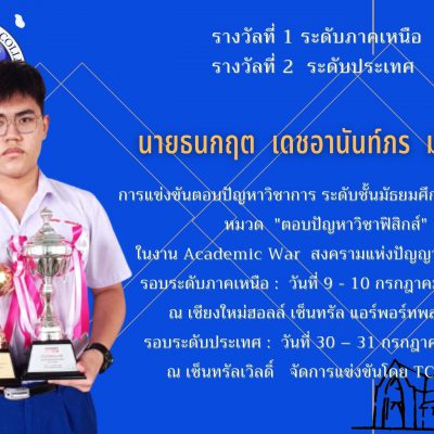 ขอแสดงความยินดีกับ นายธนกฤษ  เดชอานันท์ภร  ม.6/3  ที่ได้รับรางวัลที่ 1 ระดับภาคเหนือ,  รางวัลที่ 2 ระดับประเทศ  จากการแข่งขันตอบปัญหาวิชาการ ระดับชั้นมัธยมศึกษาตอนปลาย  หมวด “ตอบปัญหาวิชาฟิสิกส์”   ในงาน Academic War สงครามแห่งปัญญา ครั้งที่ 4   จัดการแข่งขันโดย TCaster