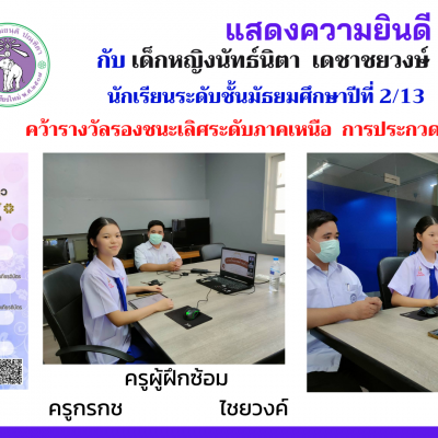 ขอแสดงความยินดีกับ เด็กหญิงนัทธ์นิตา เดชาชยวงษ์ นักเรียนชั้นมัธยมศึกษาปีที่ 2 คว้ารางวัลรองชนะเลิศอันดับที่ 1 การประกวดอ่านข่าว ระดับภาคเหนือ “อ่านข่าวเล่าเรื่องประเทืองสังคม” ระดับชั้นมัธยมศึกษาตอนต้น (ม.๑-๓) หรือเทียบเท่า (รอบชิงชนะเลิศ) เนื่องในงานวันภาษาไทยแห่งชาติ ประจำปี ๒๕๖๕ “อัตลักษณ์อักษรา วัจนาสืบสำเนียง” สาขาวิชาภาษาไทย ภาควิชาหลักสูตร การสอนและการเรียนรู้ คณะศึกษาศาสตร์ มหาวิทยาลัยเชียงใหม่ วันที่ ๒๕ กรกฎาคม ๒๕๖๕
