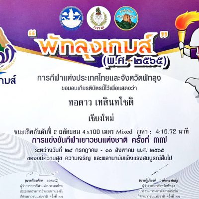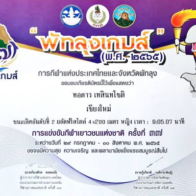 ขอแสดงความยินดีกับ นางสาวทอดาว เทสินทโชติ ชั้น ม.4/11 นักกีฬาว่ายน้ำ ที่ได้รับรางวัลชนะเลิศอันดับที่ 2 ว่ายน้ำ ผลัดผสม 4×100 เมตร Mixed และรางวัลชนะเลิศอันดับที่ 2 ว่ายน้ำ ผลัดฟรีสไตล์ 4×200 เมตร จากการแข่งขันกีฬาเยาวชนแห่งชาติ ครั้งที่ 37 “พัทลุงเกมส์” ระหว่างวันที่ 29 กรกฎาคม – 10 สิงหาคม 2565 ณ จังหวัดพัทลุง จัดการแข่งขันโดย การกีฬาแห่งประเทศไทย ร่วมกับ จังหวัดพัทลุง