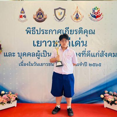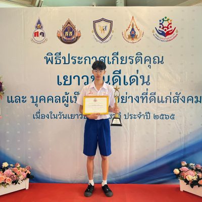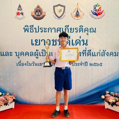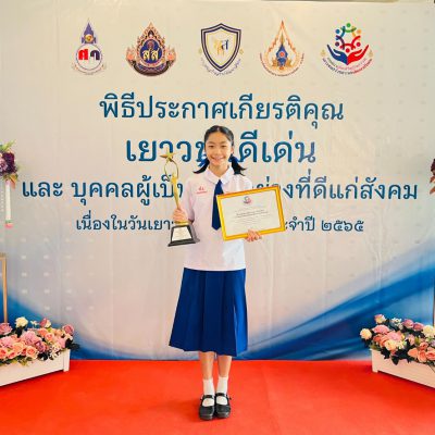 ขอแสดงความยินดีกับนักเรียนที่ได้เข้าร่วมพิธีประกาศเกียรติคุณเยาวชนดีเด่น และบุคคลผู้เป็นแบบอย่างที่ดีแก่สังคม เนื่องในวันเยาวชนแห่งชาติ ประจำปี 2565