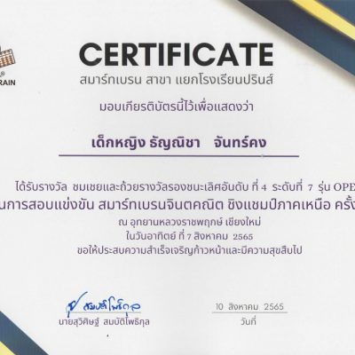 ที่ได้รับรางวัลชมเชยและถ้วยรางวัลรองชนะเลิศอันดับที่ 4 ระดับที่ 7 รุ่น OPEN การสอบแข่งขันสมาร์ทเบรนจินตคณิต ชิงแชมป์ภาคเหนือ ครั้งที่ 20
