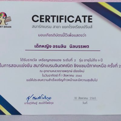 ขอแสดงความยินดีกับเด็กหญิงอรนลิน นิลบรรพต ชั้น ป.2/13 ได้รับรางัลเหรียญทองแดง ระดับที่ 2 รุ่นอายุไม่ถึง 9ปี จากรายการสอบแข่งขันสมาร์ทเบรน จินตคณิตชิงแชมป์ภาคเหนือ ครั้งที่ 20 ณ อุทยานหลวงราชพฤกษ์เชียงใหม่ วันอาทิตย์ที่ 7 สิงหาคม 2565 จัดโดย สมาร์ท เบรน ระดับภาค