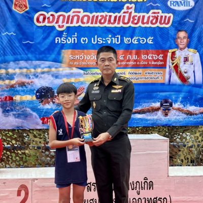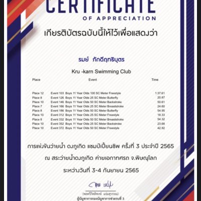 ที่ได้รับถ้วยรางวัลนักกีฬายอดเยี่ยม อันดับที่ 10 รุ่นอายุ 11 ปี ชาย การแข่งขันว่ายน้ำ ดงภูเกิด แชมเปี้ยน ครั้งที่ 3 ประจำปี 2565