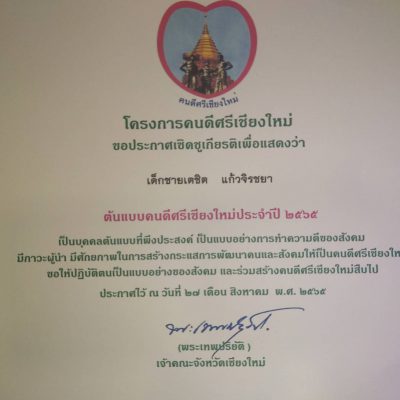 มีภาวะผู้นำ มีศักยภาพในการสร้างกระแสการพัฒนาคนและสังคมให้เป็นคนดีศรีเชียงใหม่ ให้ไว้ ณ วันที่ 27 สิงหาคม 2565