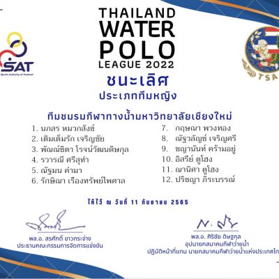 ที่ได้รับรางวัลชนะเลิศ ประเภททีมหญิง การแข่งขัน THAILAND WATER POLO LEAGUE 2022 จัดโดย Sports Authority of Thailand