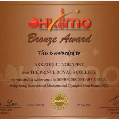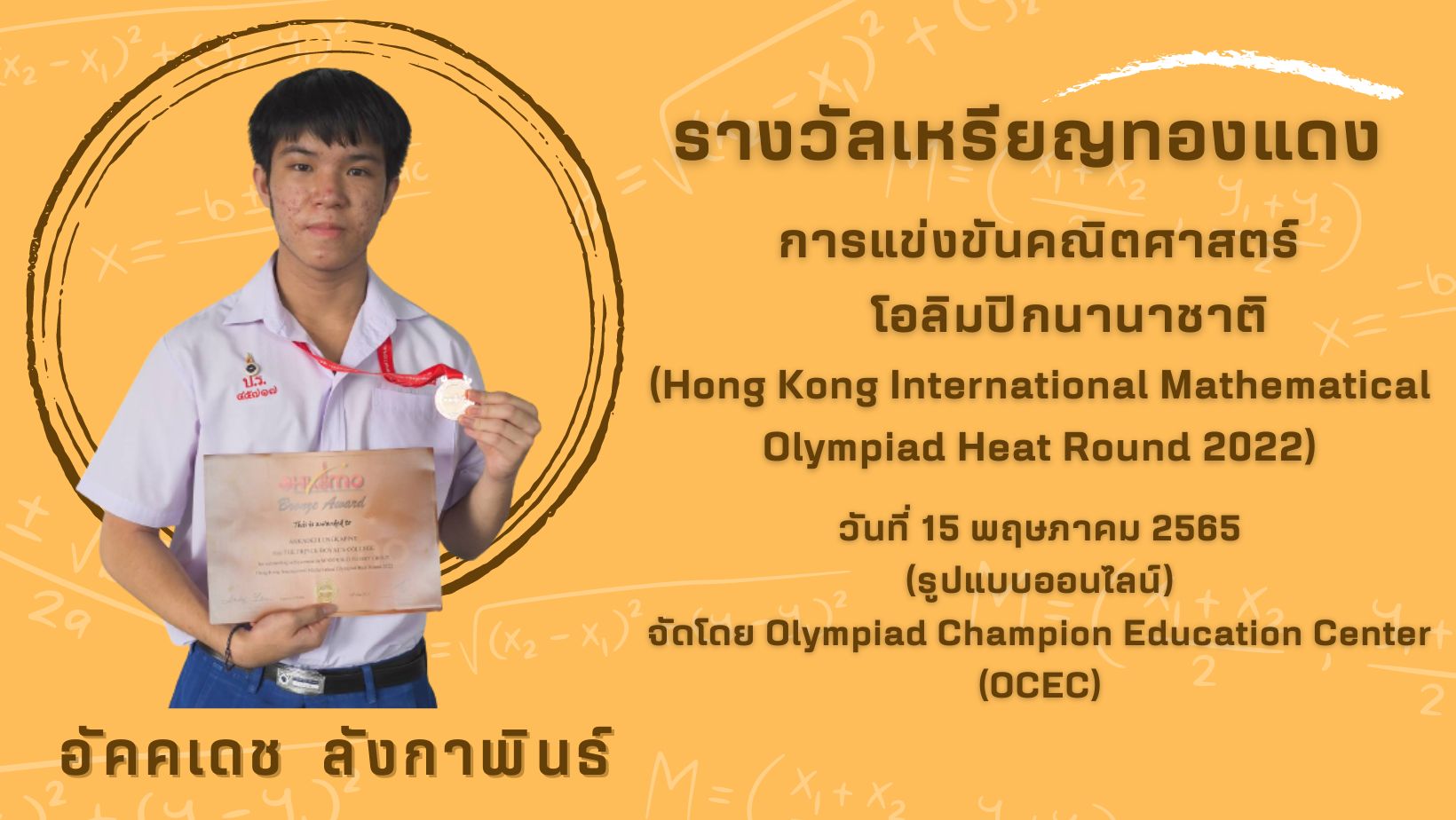 ขอแสดงความยินดีกับ นายอัคคเดช ลังกาพินธ์ ม.5/3 ที่ได้รับรางวัลเหรียญทองแดง จากการแข่งขันคณิตศาสตร์โอลิมปิกนานาชาติ (Hong Kong International Mathematical Olympiad Heat Round 2022 (รูปแบบออนไลน์) เมื่อวันที่ 15 พฤษภาคม 2565 จัดการแข่งขันโดย Olympiad Champion Education Center (OCEC)