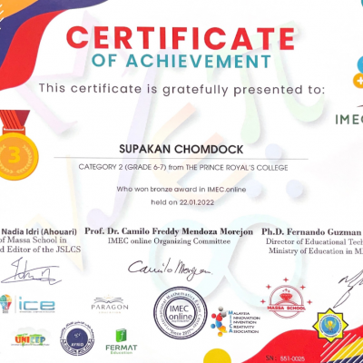 ขอแสดงความยินดีกับ เด็กชายศุภกานต์ ชมดอก ม.2/2 ได้รับรางวัล Certificate of Achievement และ Bronze Award Category 2 (Grade 6-7) ของ IMEC Online สอบวันที่ 22 มกราคม 2565 (Online)