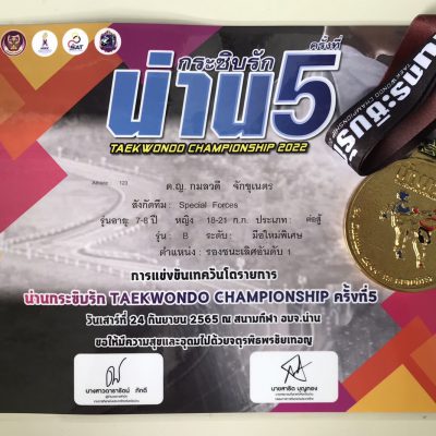 ขอแสดงความยินดีกับเด็กหญิงกมลวดี จักขุเนตร ชั้น ป.3/2 เข้าร่วมการแข่งขันเทควันโด รายการ น่านกระซิบรัก TAEKWONDO CHAMPIONSHIP ครั้งที่ 5 ได้รับรางวัลรองชนะเลิศอันดับ 1 เหรียญเงิน การแข่งขันเทควันโด รุ่นอายุ 7 – 8 ปี หญิง รุ่น B น้ำหนัก 18 – 21 ก.ก. ประเภทต่อสู้ KYORUGI สังกัดทีม Special forces ณ สนามกีฬา อบจ. น่าน เมื่อวันที่ 24 กันยายน พ.ศ. 2565 จัดโดย สโมสรธนาธารเทควันโดน่านยิมส์ ระดับภาค