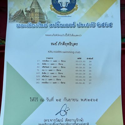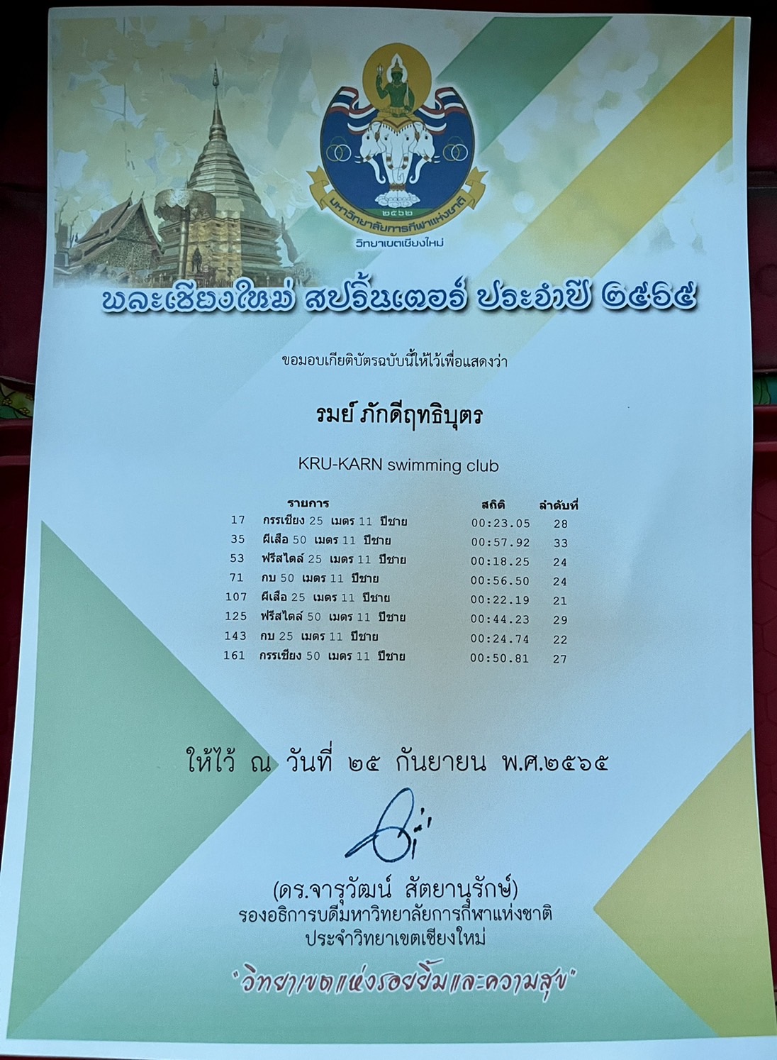 จากการแข่งขันว่ายน้ำ 52 ปี พละเชียงใหม่ สปริ้นเตอร์ 2565 (รางวัลจังหวัด) จัดโดย มหาวิทยาลัยการกีฬาแห่งชาติ เชียงใหม่