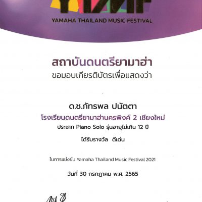 ขอแสดงความยินดีกับ เด็กชายภัทรพล ปนัตตา นักเรียนชั้นมัธยมศึกษาปีที่ 1 ได้รับรางวัลดีเด่น (Outstanding award) รายการ Piano Solo รุ่นอายุไม่เกิน 12 ปี ในการแข่งขันระดับประเทศ Yamaha Thailand Music Festival 2021 วันที่ 30 กรกฎาคม 2565