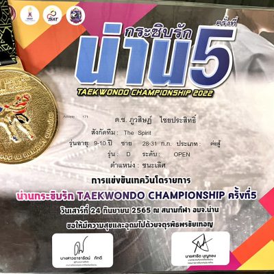 ขอแสดงความยินดีกับเด็กชายภูวสิษฏ์ ไชยประสิทธิ์ ชั้น ป 3/7 TEAM SMART TAEKWONDO (The Spirit) ได้รับรางวัลชนะเลิศ (เหรียญทอง) ประเภทต่อสู้ รุ่นอายุ 9-10 ปี Class A / Open ชาย น้ำหนัก 28-31 กิโลกรัม ในการแข่งขันกีฬาเทควันโดรายการ น่านกระซิบรัก TAEKWONDO CHAMPIONSHIP ครั้งที่ 5 วันเสาร์ที่ 24 กันยายน 2565 ณ สนามกีฬา อบจ. น่าน จังหวัดน่าน จัดโดยสมาคมกีฬาจังหวัดน่าน ระดับภาค