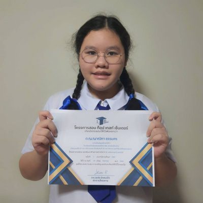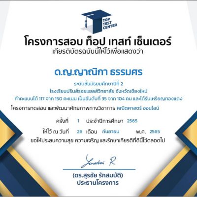 ขอแสดงความยินดีกับ เด็กหญิง ญาณิกา  ธรรมศร  นักเรียนชั้นมัธยมศึกษาปีที่ 2 ได้รับเกียรติบัตรและเหรียญทองแดง “โครงการทดสอบ และพัฒนาศักยภาพทางวิชาการ คณิตศาสตร์ ออนไลน์ ระดับมัธยมศึกษาปีที่ 2 (โครงการสอบ ท๊อป เทสท์ เซ็นเตอร์) เมื่อวันที่ 26 กันยายน 2565 (แข่งขันระดับประเทศ)