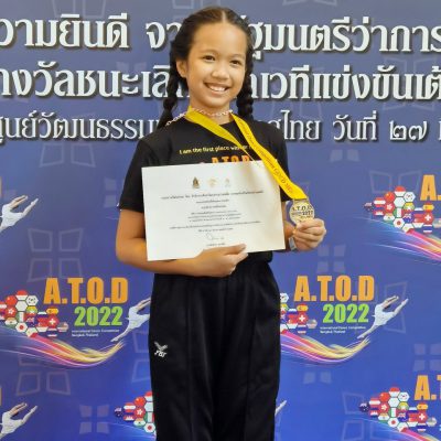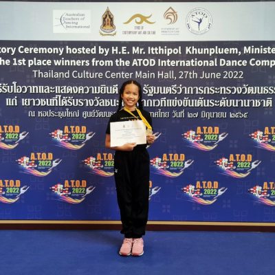 ที่ได้รับรางวัลเหรียญทองประเภทตำราเรียน การแข่งขันศิลปะการเต้นระดับนานาชาติ ชิงถ้วยพระราชทานสมเด็จพระเทพรัตนราชสุดาฯสยามบรมราชกุมารี A.T.O.D International Dance Competition 2022 ณ Akers Theatre Bangkok Thailand กรุงเทพมหานคร รับประกาศนียบัตร และรับฟังโอวาท