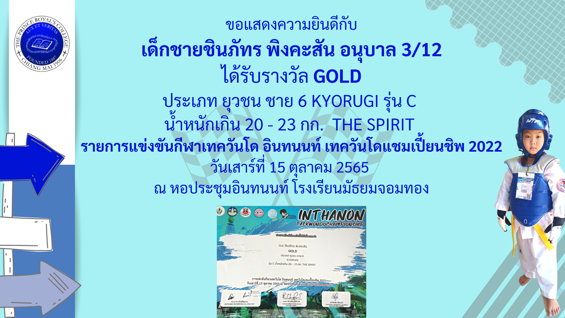 ขอแสงความยินดีกับเด็กชายชินภัทร พิงคะสัน อนุบาล 3/12 รางวัล GOLD ประเภท ยุวชน ชาย 6 KYORUGI รุ่น C น้ำหนักเกิน 20 – 23 กก. THE SPIRIT รายการแข่งขันกีฬาเทควันโด อินทนนท์ เทควันโดแชมเปี้ยนชิพ 2022 วันเสาร์ที่ 15 ตุลาคม 2565 ณ หอประชุมอินทนนท์ โรงเรียนมัธยมจอมทอง