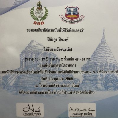ขอแสดงความยินดีกับ นายปิยังกูร ปิกวงค์ นักเรียนชั้นมัธยมศึกษาปีที่ 3 ได้รับรางวัลชนะเลิศ (เหรียญทอง) รุ่นอายุ 15-17 ปี ชาย น้ำหนัก 48 – 51 กก. และได้เป็นตัวแทนจังหวัดเชียงใหม่เข้าร่วมการแข่งขันกีฬาเยาวชน ภาค 5 จ.พิจิตร ในการแข่งขันเทควันโดรายการคัดเลือกตัวแทนนักกีฬาจังหวัดเชียงใหม่เพื่อเข้าร่วมการแข่งขันกีฬาเยาวชน ภาค 5 จ.พิจิตร ประจำปี 2565 วันที่ 13 ตุลาคม 2565 ณ โรงเรียนกีฬาจังหวัดเชียงใหม่