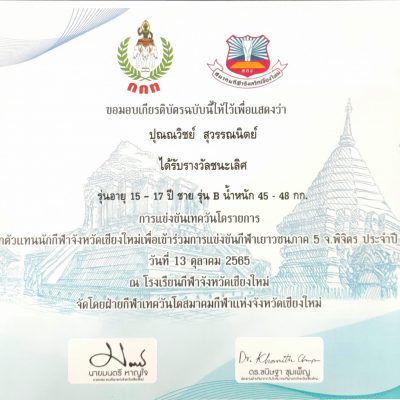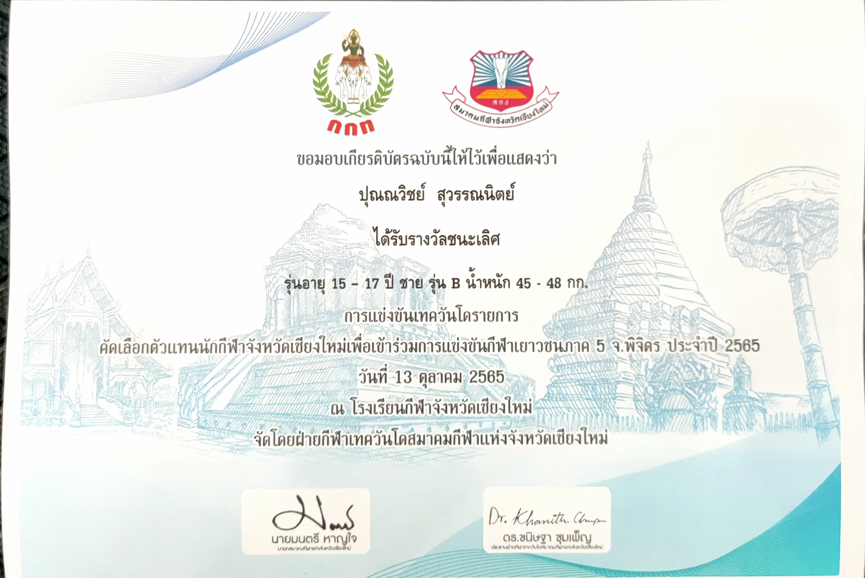 ขอแสดงความยินดีกับ เด็กชายปุณณวิชย์ สุวรรณนิตย์ นักเรียนชั้นมัธยมศึกษาปีที่ 3 ได้รับรางวัลชนะเลิศอันดับ 1 (เหรียญทอง) รุ่นเยาวชน รุ่นอายุ 15-17 ปี ชาย น้ำหนัก 45-48 กิโลกรัม ในการแข่งขันเทควันโดรายการคัดเลือกตัวแทนนักกีฬาจังหวัดเชียงใหม่ เพื่อเข้าร่วมการแข่งขันกีฬาเยาวชนภาค 5 จ.พิจิตร ประจำปี 2565″ วันที่ 13 ตุลาคม พ.ศ.2565 จัดโดย ฝ่ายกีฬาเทควันโดสมาคมกีฬาแห่งจังหวัดเชียงใหม่ ณ โรงเรียนกีฬาจังหวัดเชียงใหม่