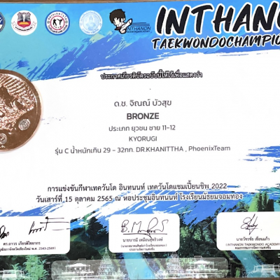 ที่ได้รับรางวัลเหรียญทองแดง การแข่งขันเทควันโด อินทนนท์ เทควันโด้แชมเปี้ยนชิพ 2022 ประเภท ยุวชน ชาย 11-12 ปี KYORUGI รุ่น C น้ำหนักเกิน 29-32 กิโลกรัม PhoenixTeam (การแข่งขันระดับจังหวัด) เมื่อวันที่ 15 ตุลาคม 2565 ณ หอประชุมอินทนนท์ โรงเรียนมัธยมจอมทอง