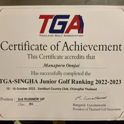 รายการแข่งขันกอล์ฟ TGA-SINGHA Junior Golf Ranking 2022-2023 (ระดับภาคเหนือ) จัดโดย สมาคมกีฬากอล์ฟแห่งประเทศไทยในพระบรมราชูปถัมภ์ ภาคเหนือตอนบน (การแข่งขันระดับภาค) ระหว่างวันที่15-16 ตุลาคม 2565 ณ สนามกอล์ฟสันติบุรี เชียงราย