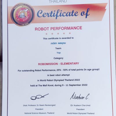 ที่ได้รับรางวัลอันดับที่ 27 Bronze elementary category ทีม Yop จากการแข่งขันโอลิมปิกหุ่นยนต์ wor 2022 รอบชิงชนะเลิศแห่งประเทศไทย
