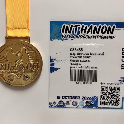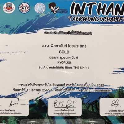ขอแสดงความยินดีกับเด็กหญิงพิชชานันท์ ไชยประสิทธิ์ อนุบาล 3/7 รางวัล GOLD ประเภท ยุวชน หญิง 6 KYORUGI รุ่น A น้ำหนักเกิน 18 กก. THE SPIRIT รายการแข่งขันกีฬาเทควันโด อินทนนท์ เทควันโดแชมเปี้ยนชิพ 2022 วันเสาร์ที่ 15 ตุลาคม 2565 ณ หอประชุมอินทนนท์ โรงเรียนมัธยมจอมทอง
