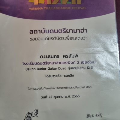 ขอแสดงความยินดีกับ เด็กชายธนกร ศรลัมพ์ นักเรียนชั้นมัธยมศึกษาปีที่ 1 ได้รับรางวัลชนะเลิศ ในการแข่งขัน Yamaha Thailand Music Festival 2021 ประเภท Junior Guitar Duet รุ่นอายุไม่เกิน 12 ปี ระดับประเทศ ณ โรงเรียนดนตรีสยามกลการ สถาบันดนตรียามาฮ่า (สำนักงานใหญ่) เมื่อวันที่ 22 ตุลาคม 2565