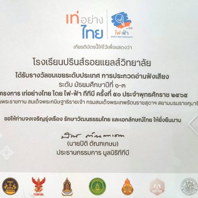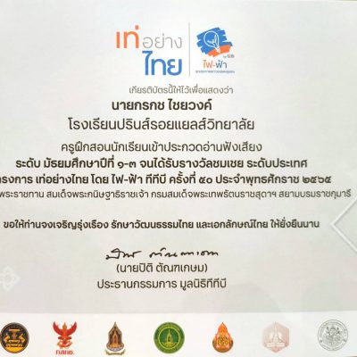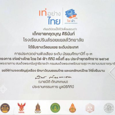 ขอแสดงความยินดีกับ เด็กชาย กฤตบุญ ศิรินันท์ นักเรียนระดับมัธยมศึกษาปีที่ 2 รางวัลชมเชย ระดับประเทศ การประกวดอ่านฟังเสียงจากผู้เข้าแข่งขันทั่วประเทศ ที่ผ่านเข้ารอบระดับภูมิภาค เป็นตัวแทนแข่งขันระดับประเทศชิงถ้วยพระราชทานสมเด็จพระกนิษฐาธิราชเจ้า กรมสมเด็จพระเทพรัตนราชสุดา ฯ สยามบรมราช กุมารี และทุนการศึกษา ครั้งที่ ๕๐ ประจำปีพุทธศักราช ๒๕๖๕ โครงการ “เท่อย่างไทย โดย ไฟ-ฟ้า ทีทีบี” ในวันจันทร์ที่ 31 ตุลาคม 2565 นี้ ณ ธนาคารทหารไทยธนชาติ จำกัด (มหาชน) สำนักงานใหญ่ กรุงเทพมหานครฯ โดยมีคุณครูกรกช ไชยวงค์ ครูผู้สอนวิชาภาษาไทยระดับมัธยมศึกษาตอนต้น เป็นผู้ฝึกซ้อม