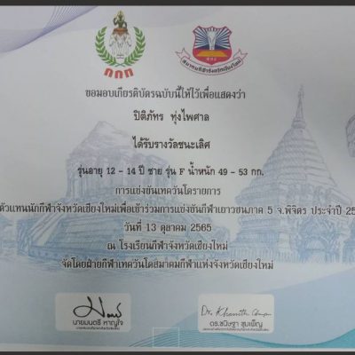 ขอแสดงความยินดีกับ เด็กชายปีติภัทร ทุ่งไพศาล ชั้นมัธยมศึกษาปีที่ 2 ได้รับรางวัลชนะเลิศอันดับ 1 (เหรียญทอง) รุ่นเยาวชน รุ่นอายุ 12-14 ปี น้ำหนัก 49-53 กิโลกรัม ในการแข่งขันเทควันโด รายการคัดเลือกตัวแทนนักกีฬาจังหวัดเชียงใหม่เพื่อเข้าร่วมรายการแข่งขัน กีฬาเยาวชนภาค 5 จังหวัดพิจิตร ประจำปี 2565 จัดโดย ฝ่ายกีฬาเทควันโดสมาคมกีฬาแห่งจังหวัดเชียงใหม่ ณ โรงเรียนกีฬาจังหวัดเชียงใหม่ เมื่อวันที่ 13 ตุลาคม 2565
