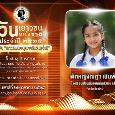 “รางวัลเยาวชนและบุคคลดีเด่นแห่งปี” ในโอกาสวันเยาวชนแห่งชาติ ประจำปี 2565 โดย สภาศิลปินสร้างสรรค์สังคม เมื่อวันที่ 22 ตุลาคม 2565