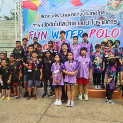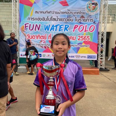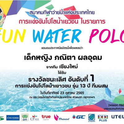 ที่ได้รับถ้วยรางวัลชนะเลิศอันดับ 1 และเหรียญทอง fun water polo รุ่น 13 ปีหญิง (ทีมผสม) จัดโดย สมาคมว่ายน้ำแห่งประเทศไทย