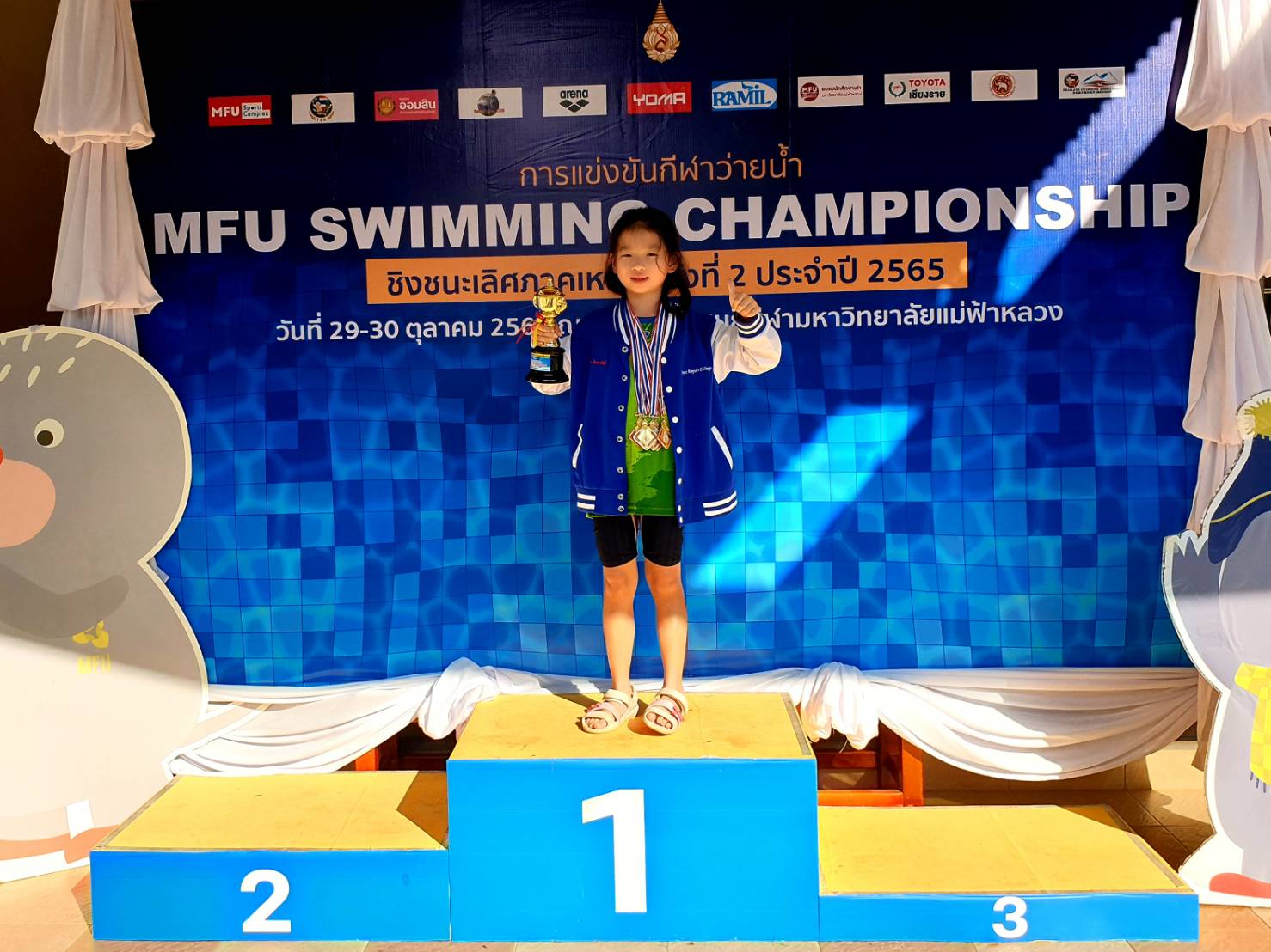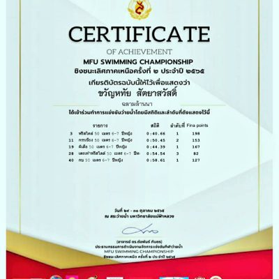 ขอแสดงความยินดีกับเด็กหญิงขวัญหทัย สัตยาสวัสดิ์ ชั้น ป.1/4 เข้าร่วมการแข่งขันว่ายน้ำรายการ MFU SWIMMING CHAMPIONSHIP 5th (ชิงชนะเลิศภาคเหนือ ประจำปี 2565) ได้รับ ได้ ถ้วยรางวัลนักกีฬายอดเยี่ยม อันดับที่ 1 กลุ่ม 6 ( รุ่นอายุ 6-7 ปี ) // 4 เหรียญทอง ฟรีสไตล์ 50 เมตร (ทำลายสถิติประเทศไทยรุ่นอายุ6-7ปี หญิง ) , ผีเสื้อ 50 เมตร (ทำลายสถิติประเทศไทยรุ่นอายุ 6-7 ปีหญิง ) , กบ 50 เมตร , เกาะโฟมแตะขา 50 เมตร / 1 เหรียญเงิน กรรเชียง 50 เมตร (รับรองสถิติโดยสมาคมว่ายน้ำแห่งประเทศไทย ) ณ สระว่ายน้ำ ศูนย์กีฬามหาวิทยาลัยแม่ฟ้าหลวง ระหว่างวันที่ 29-30 ตุลาคม พ.ศ. 2565 จัดโดย สมาคมว่ายน้ำแห่งประเทศไทย ร่วมกับ มหาวิทยาลัยแม่ฟ้าหลวง ระดับภาค