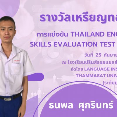 ขอแสดงความยินดีกับ นายธนพล ศุกรินทร์ ม.5/1 รางวัลเหรียญทอง จากการแข่งขัน Thailand English Skills Evaluation Test 2022 เมื่อวันที่ 25 กันยายน 2565 ณ โรงเรียนปรินส์รอยแยลส์วิทยาลัย จัดการแข่งขันโดย Language Institute Thammasat University