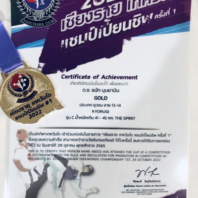 ขอแสดงความยินดีกับ เด็กชายธนัท บุญยามิน นักเรียนชั้นมัธยมศึกษาปีที่ 2 (สังกัดทีม SPIRIT) ได้รับถ้วยกีฬานักกีฬายอดเยี่ยมประเภทยุวชนชาย อายุ 13 – 14 ปี และเหรียญทองประเภทยุวชนชายอายุ 13 – 14 ปี น้ำหนัก 41 – 45 กิโลกรัม รายการ 2022 เชียงราย เทควันโด แชมป์เปี้ยนชิพ ครั้งที่ 1 เมื่อวันที่ 29 ตุลาคม 2565 ณ มหาวิทยาลัยราชภัฎเชียงราย จัดโดย สโมสรเชียงรายเทควันโด