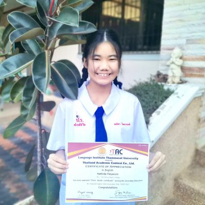 5. เด็กหญิงณธิดา ไพยารมณ์ รางวัลเกียรติบัตรเหรียญเงิน ระดับชั้นมัธยมศึกษาตอนต้น