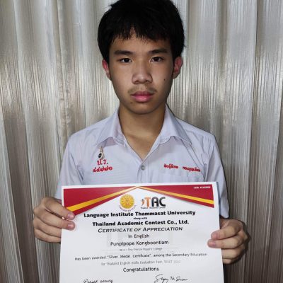 2. เด็กชายฐปนพัฒน์ เจียสวัสดิ์ รางวัลเกียรติบัตรเหรียญเงิน ระดับชั้นมัธยมศึกษาตอนต้น