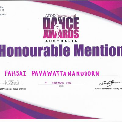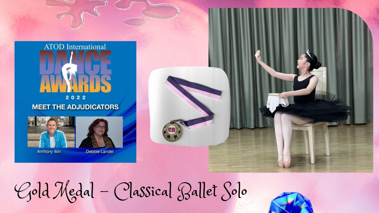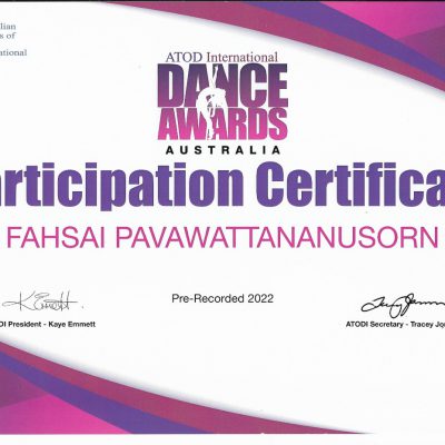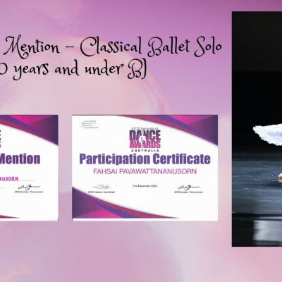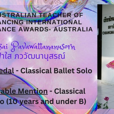 ที่ได้รับรางวัล เหรียญทอง จากการแข่งประเภท Classical Ballet Solo เกียรติบัตร Honourable Mention ประเภท Classical Ballet Solo – 10 years and under B จากการแข่งขัน ATOD International Dance Awards ประเทศ Australia (Pre-recorded) เมื่อวันที่ 11 พฤศจิกายน 2565