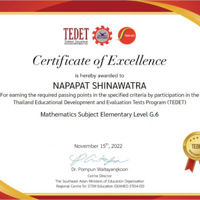 2. ใบประกาศคะแนนผ่านเกณฑ์การสอบคณิตศาสตร์ จากโครงการประเมินและพัฒนาสู่ความเป็นเลิศทางคณิตศาสตร์และวิทยาศาสตร์ (TEDET)